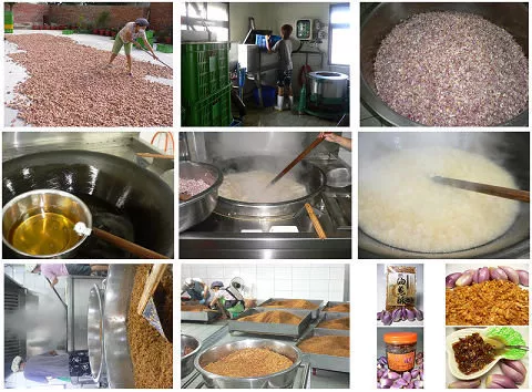 紅蔥頭含有大量的水份,隨著水份的蒸發,而變得金黃酥脆,所以被取而代之的蔥頭的組織吸附了部份油脂也將水份排出蒸發,每一鍋也必須重新補足油量,這是一種流動性相當大的製作方式,不同於家庭或小量製作的,沒有明顯的流動,一鍋油反覆使用。