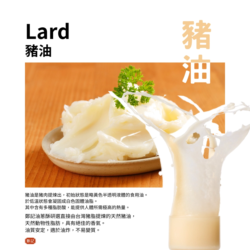 To ensure both safety and flavor, Cheng-Chi developed its own production standards for rendering pork lard. Using traditional low-heat slow-cooking methods, we extract the essence of the fat while maintaining its natural aroma and clarity. The resulting lard is snow-white, clean, and fragrant—free from chemical additives, ensuring pure, natural, and safe quality oil for every dish.